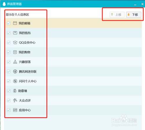 进入【界面办理器】页面,可以移动的图标有:我的邮箱、我的钱包、QQ会员中间、我的购物、乐趣部落、腾讯网迷您版、问问小我中间、勋章墙、公共点评、应用中间,可以经由过程上移或者下移进行移动。