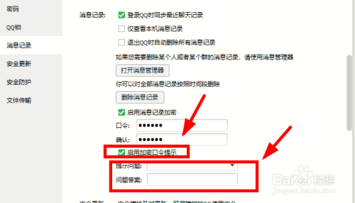 7、可以勾选【启用加密口令提醒】,输入提醒问题和谜底