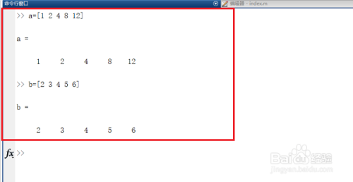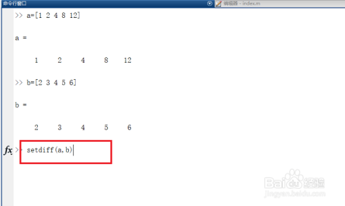 第二步下面来利用setdiff函数,输入a=[1 2 4 8 12],b=[2 3 4 5 6]来建立两个调集,如下图所示: