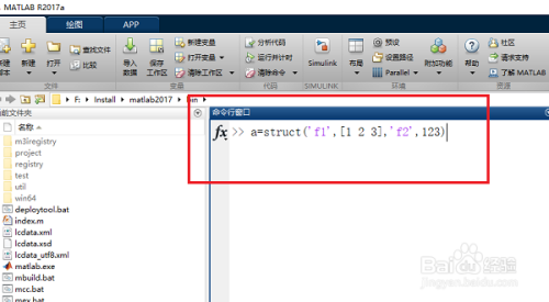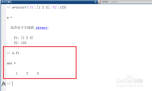 第二步下面来利用一下struct函数,输入a=struct('f1',[1 2 3],'f2',123),建立布局体数组a,如下图所示: