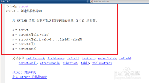 第一步我们首先需要知道struct函数本家儿要用于建立布局体数组,在matlab号令行窗口输入help struct,可以看到函数用法,如下图所示:
