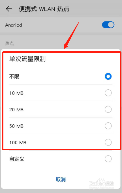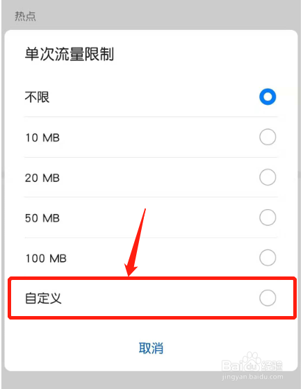 华为手机默认不限制热点的单次流量。直接点击其他流量,可选10M、20M、50M、100M,就可更改单次流量限制。