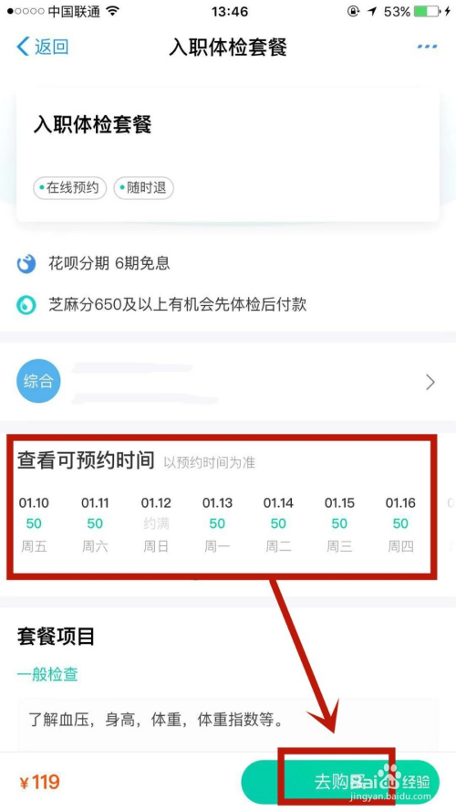 5.查看本身可以预约的时候后点击右下角的去采办。