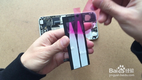将新电池放置在桌面,撕失落蓝色透明膜,将易拉胶贴到新电池上,翻面将易拉胶预留部门的蓝色透明膜也撕失落,拇指折压红色透明膜将预留部门易拉胶贴好,再将电池排线扣瞄准位置扣上,这样做是防止电池贴歪。