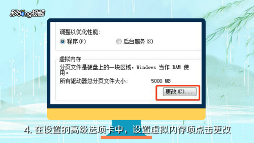 - 4在设置的高级选项卡中,设置虚拟内存项点击“更改”。