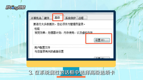 - 3在系统属性对话框中选择高级选项卡,在机能中点击“设置”。