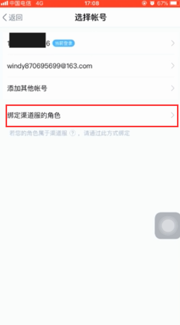 - 4若是脚色是渠道服,回到选择账号的页面,点击“绑定渠道服脚色”。
