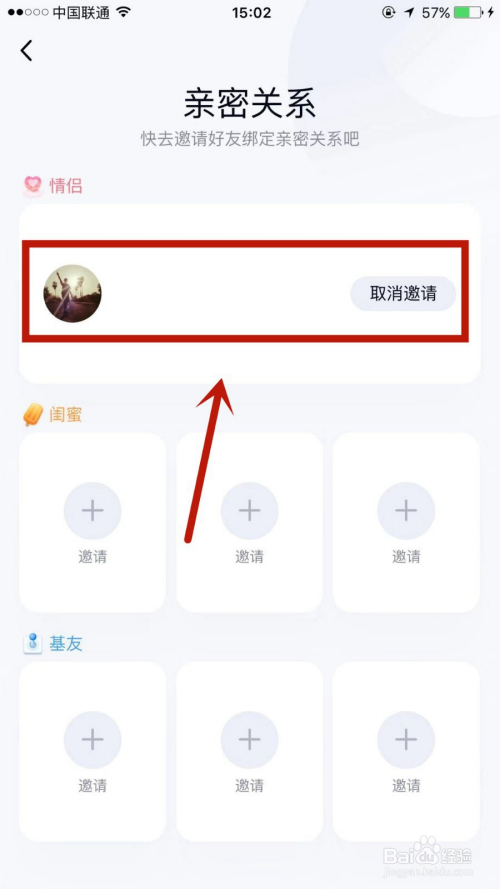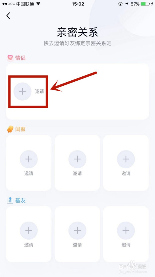 在亲密关系页面,找到本身想要设置的关系并点击+邀请(这边以情侣为例)。
