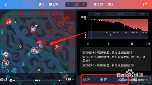 4、进入对局回首页面,我们可以看到简化的对战过程和敌我两边经济对比,在右下方还能查看事务和记实等信息。