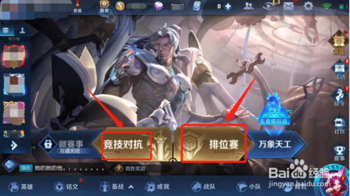 登录进入游戏界面,在游戏界面点击“竞技匹敌”或者“排位赛”,起头一场新的对战。如图所示