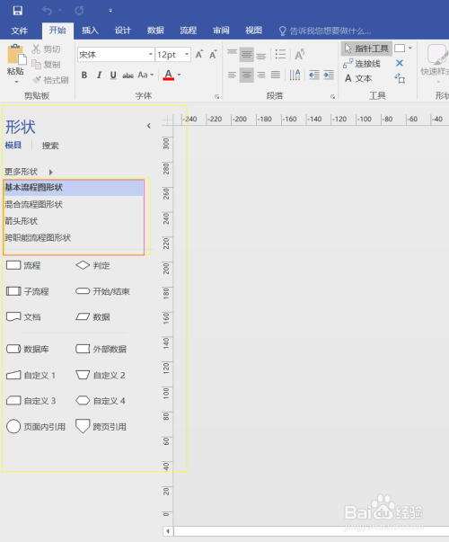 第二步,点击“更多外形”——“流程图”——勾选“根基流程图外形”,“夹杂流程图外形”,“箭头外形”“跨本能机能流程图外形”