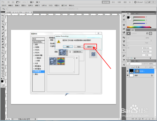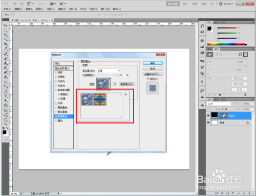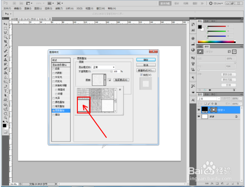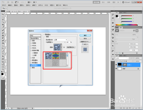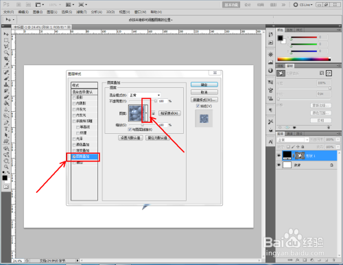 双击图示自界说图案图层,弹出图层样式设置栏。勾选【图案叠加】,点击图示小三角,弹出图案选项栏;