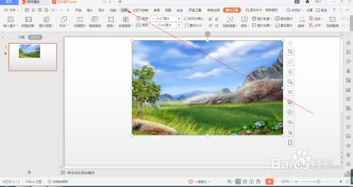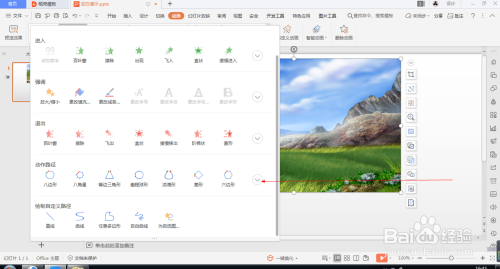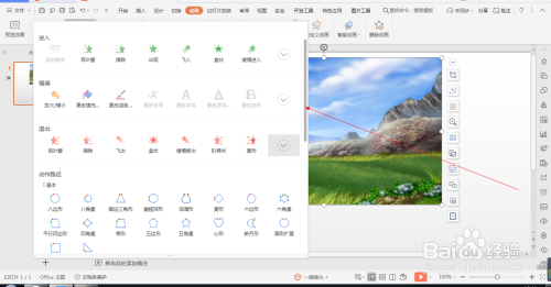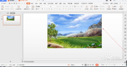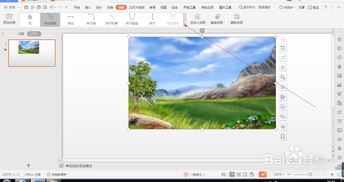 1.如图所示,我们在这个幻灯片上添加了一张这样的风光照片,为这个风光照片添加的标的目的右弧线动画。