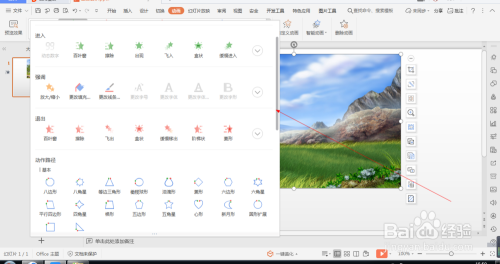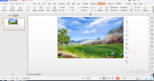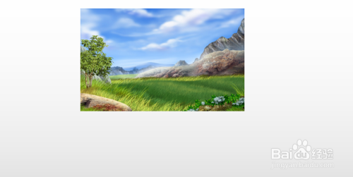 1.如图所示,我们在这个幻灯片上添加了一张这样的风光照片,为这个风光照片添加的标的目的下弧线动画。