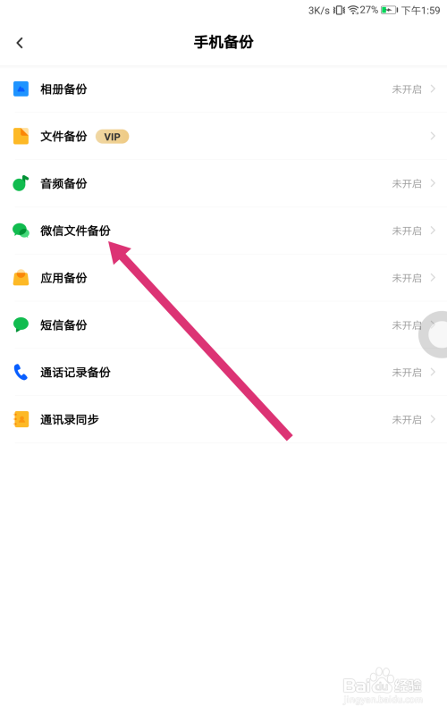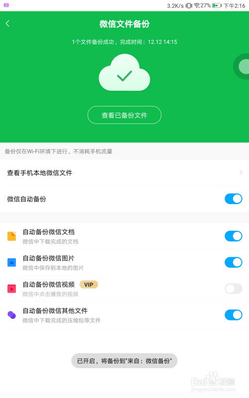 第五步,点击“微信文件备份”,进入微信文件备份,点击主动开启即可,开启后的页面如图所示。