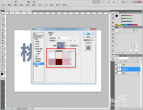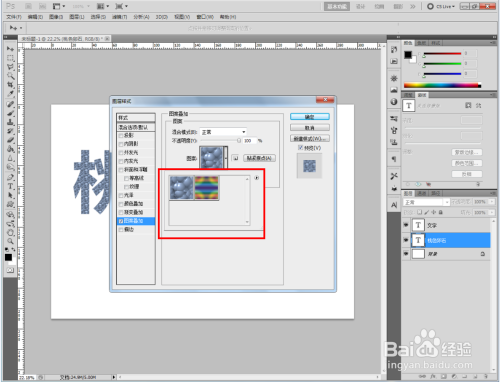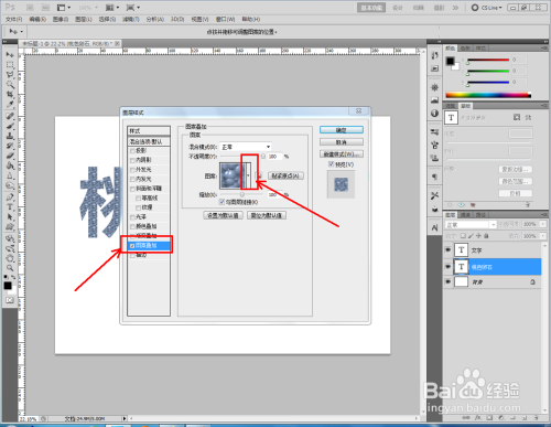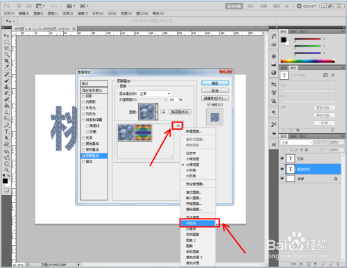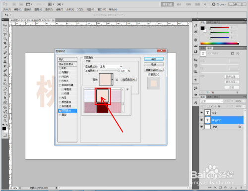 双击图示自界说图案图层,弹出图层样式设置栏。勾选【图案叠加】,点击图示小三角,弹出图案选项栏;