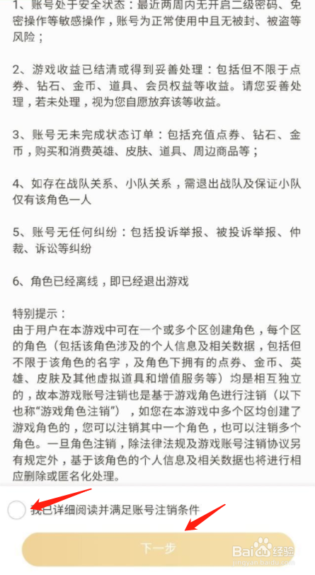 然后,我们查抄本身是否知足刊出账号的6个前提。若是知足,点击下方下一步,就可以刊出帐号啦。如图所示