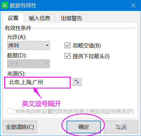 在“来历”中输入下拉菜单的可选值,如“海说神聊京,上海,广州”,注重各选项之间要用 英文的逗号 离隔,然后点击【确定】即可。