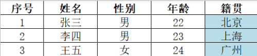 确定好表格中,哪一行或哪一列需要设置下拉选项,可选内容是什么。如下表中的"籍贯"一列,可选值为"海说神聊京,上海,广州"。