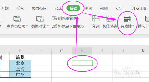 选中需要设置下拉选项的表格(可以先选中此中一个单位格,设置完毕之后再复制粘贴),然后点击【数据】菜单,再点击快捷菜单中的【有用性】。