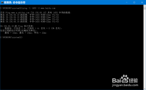 来自 39.156.66.18 的答复: 字节=1450 时候=22ms TTL=5339.156.66.18 的 Ping 统计信息: