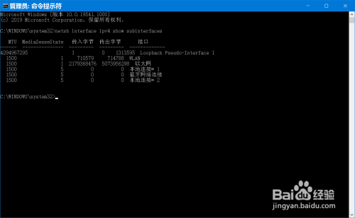 复制号令:netsh interface ipv4 show subinterfaces 到号令提醒符窗口中,然后按下键盘上的回车键,即可查看到系统的MTU值与对应的当地毗连名称: