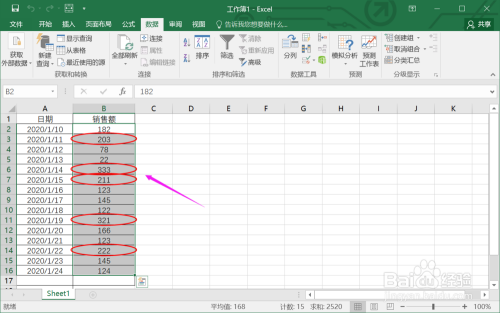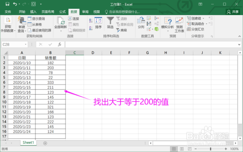 1.打开Excel工作表。假设我们有一级数据,需要从中标识出大于等于200的值。