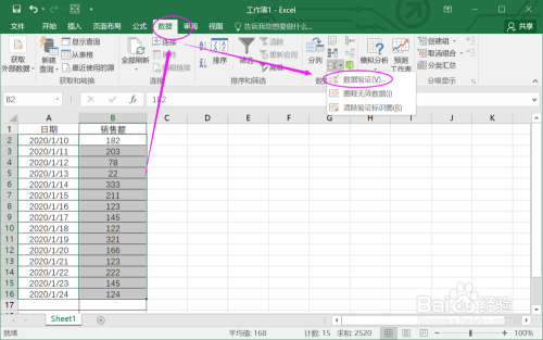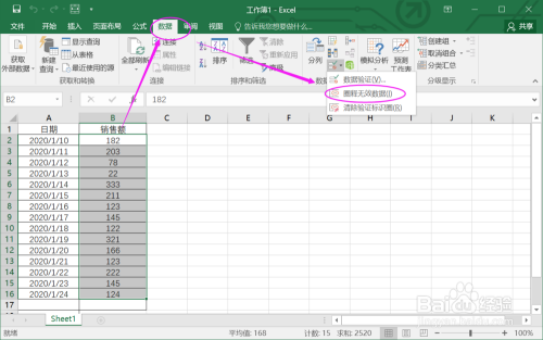 5.确定后,继续找到“数据>>圈释无效数据”。