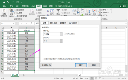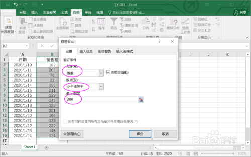 4.选择验证前提为“整数>>小于或等于>>200”。