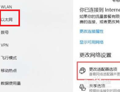 选中左侧菜单以太网,然后点击右边的更改适配器选项进入。