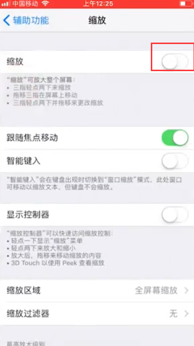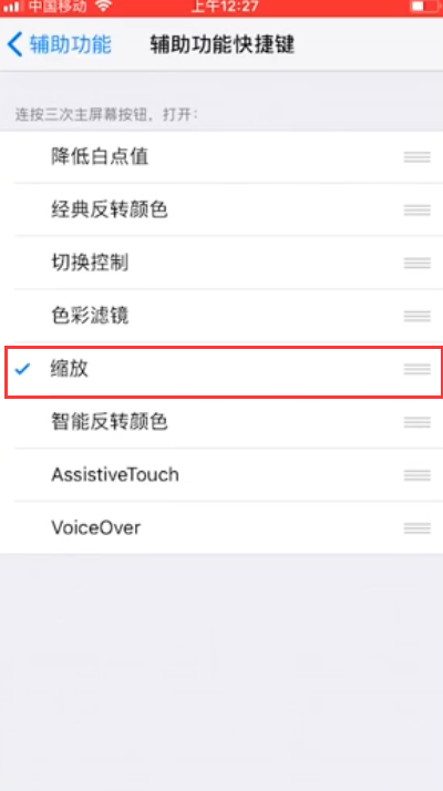 - 9选择“缩放”,快速按三次“home”键,屏幕变亮。