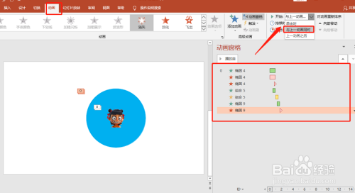 设定所有动画格局为:与上一动画同时。如图: