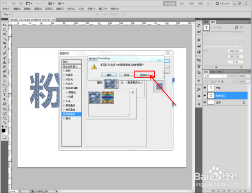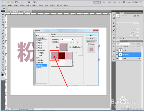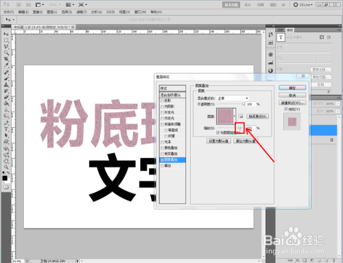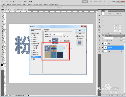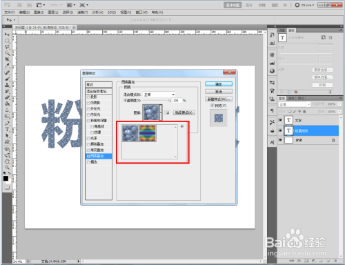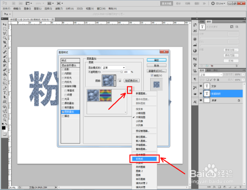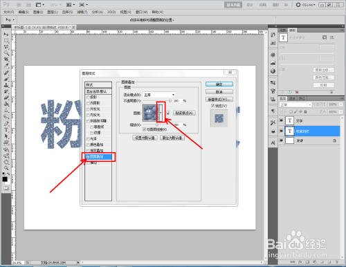 双击图示自界说图案图层,弹出图层样式设置栏。勾选【图案叠加】,点击图示小三角,弹出图案选项栏;