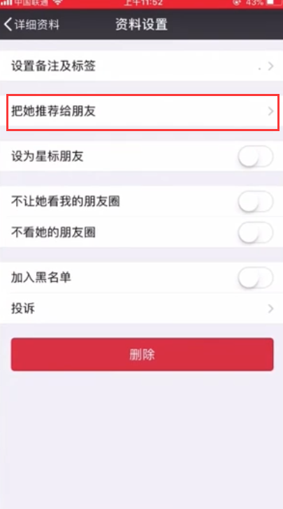 - 4在资料设置中点击下方的“把她保举给老友”。