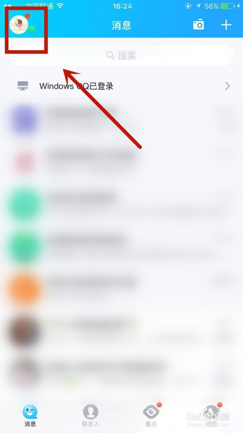 1.打开手机QQ,点击左上角本身头像。