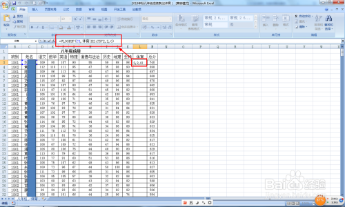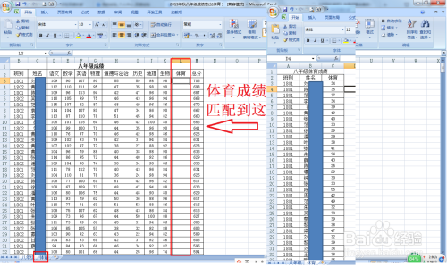 在“八年级”汇总表那边点击选择L2单位格(要输入体育成就那一列)——输入公式:=VLOOKUP(C3,体育!B2:C572,2,0)。