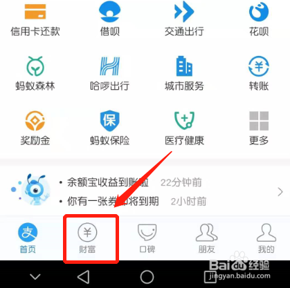 进入支付宝首页,点击“财富”。