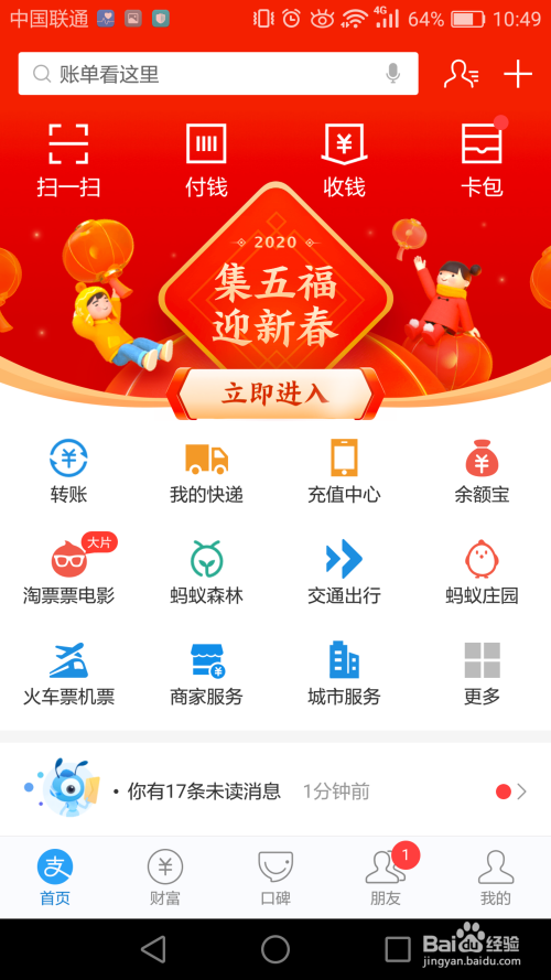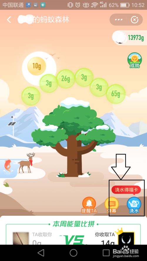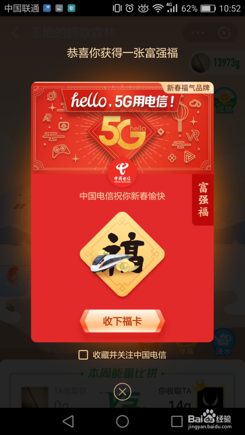 进入蚂蚁丛林,选择一个老友,替她浇水,即可收成福卡,天天最多收成两张福卡。
