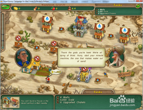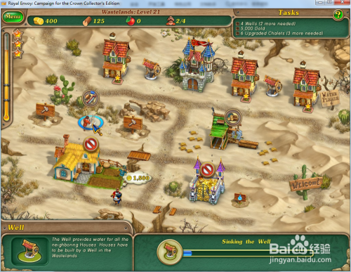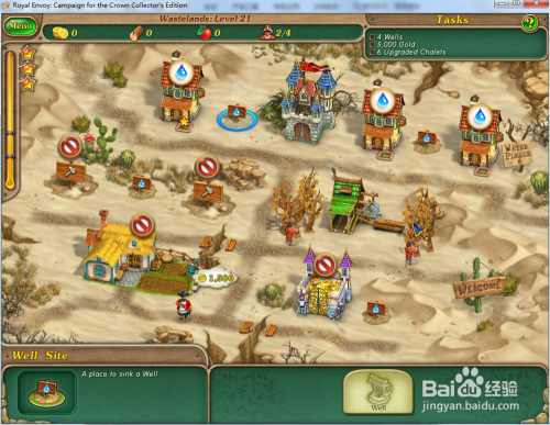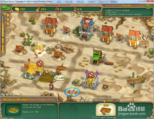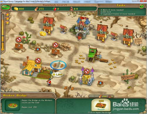 操纵工人修复左面的水井,同时将下方的木桥修复,当金币达到1500时,当即将下方的海盗赶走。