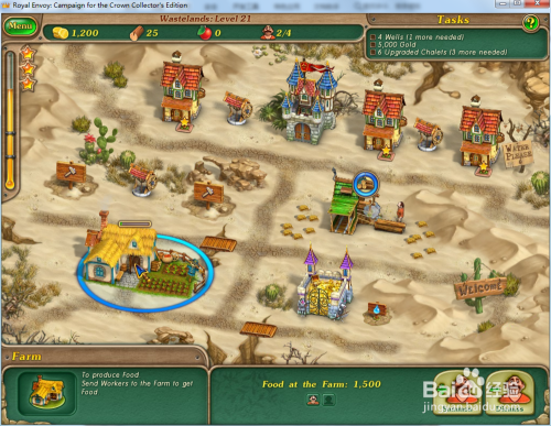 派工人进入左下方的农场,当食物足够时,点击城堡雇佣工人,然后在左面的空位上建造小屋。