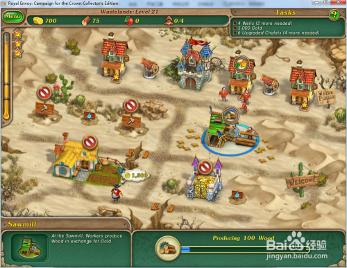 操纵工人进级上方的小屋,同时操纵锯木厂出产木头,然后操纵工人修复左面的木桥。