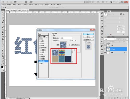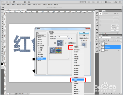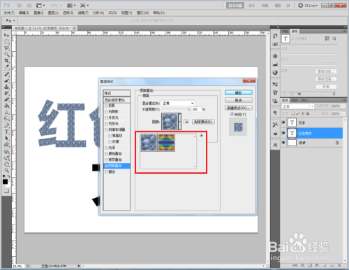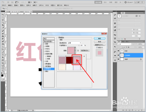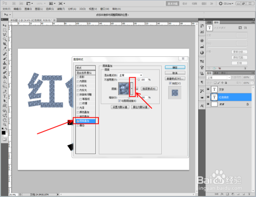 双击图示自界说图案图层,弹出图层样式设置栏。勾选【图案叠加】,点击图示小三角,弹出图案选项栏;