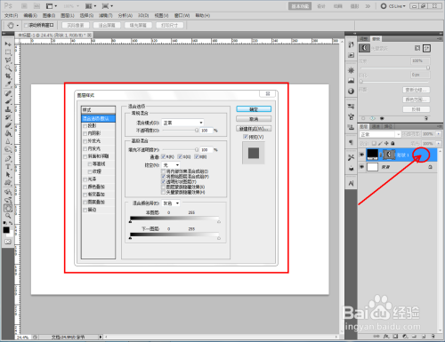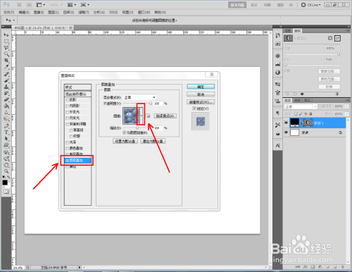 双击图示自界说图案图层,弹出图层样式设置栏。勾选【图案叠加】,点击图示小三角,弹出图案选项栏;