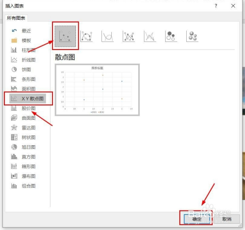 点击“XY散点图”,点击“散点图”,然后点击“确定”。