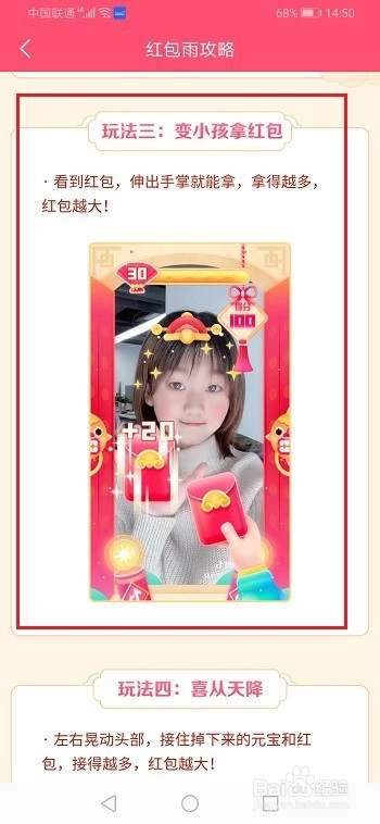 第四步喜从天降弄法,本家儿如果打开摄像头,头部动作,摆布晃悠头部接住红包和元宝,接的越多获得的红包越大