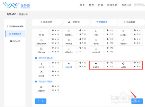进入插件设置装备摆设页面,按照本身的需求选择插件,这里我们选择“微信登录”和“qq登录”,点击“下一步”。