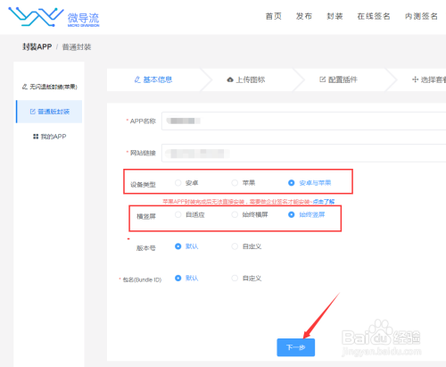 进入封装页面后,可以看到封装的具体流程。依次输入应用名称和h5链接,设备类型和反正屏可以按照本身的需要进行选择,然后点击“下一步”。