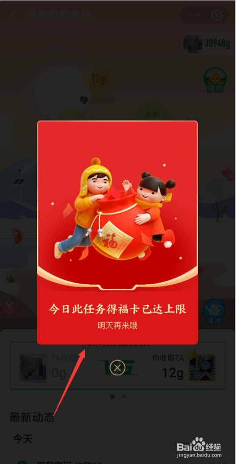 直到提醒“今日扫'福'字得福卡已达到上限”为止。在该页,可以点击“去尝尝”进入蚂蚁丛林给老友浇水获取福卡。也可以点击“X”退出该页面。见下图