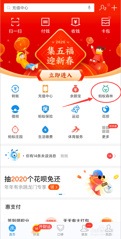 在支付宝首页,点击“蚂蚁丛林”。见下图