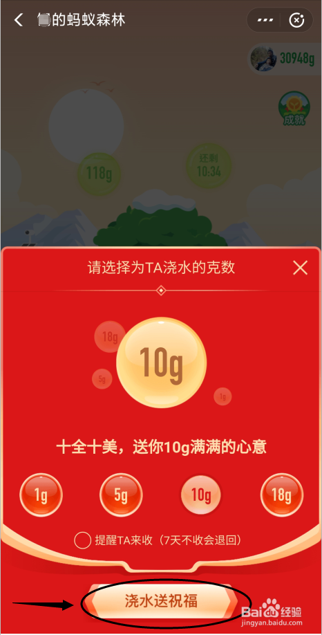 选择1g、5g、10g、18g中的任一克数(默认为10g,意为浑然一体),之后点击“浇水送祝福”。见下图